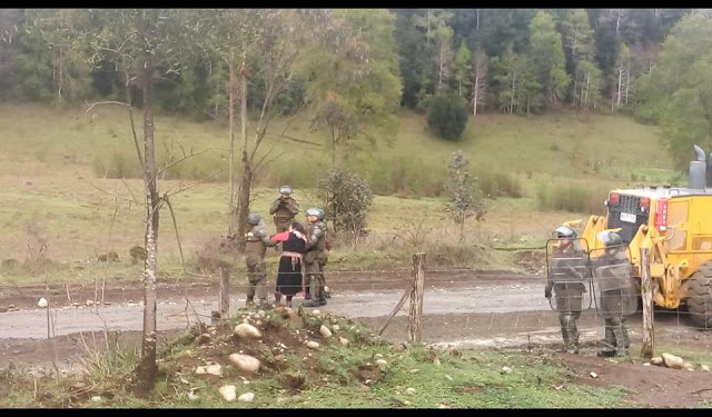 El estado de Chile pretende pavimentar un camino comunal haciéndolo público para que latifundistas accedan a territorios mapuche usurpados cuando el ejército chileno invade el territorio de la nación Mapuche.